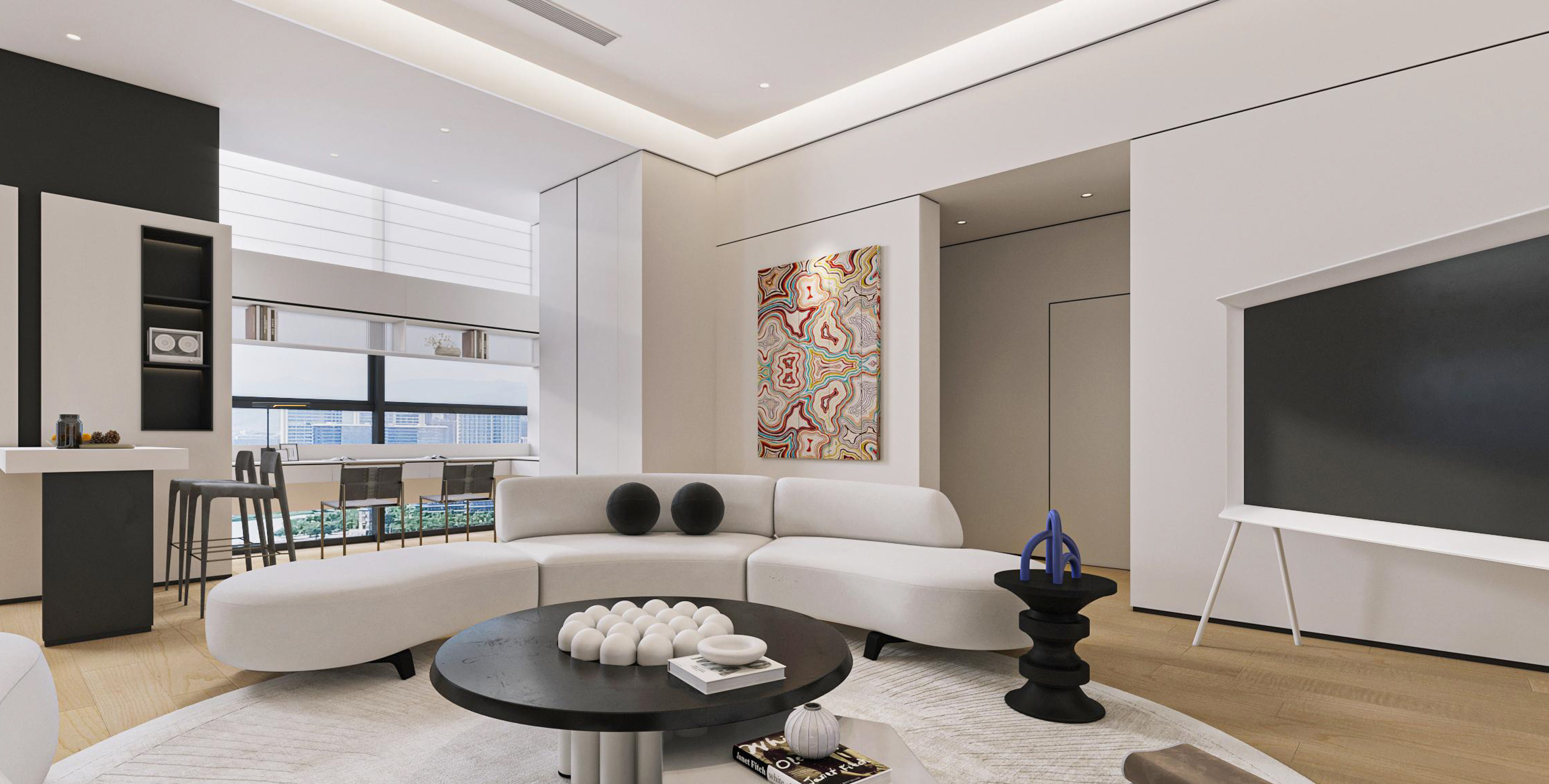 客厅以中置化布置为主,去除了传统的影视墙,营造简洁通透的空间感。