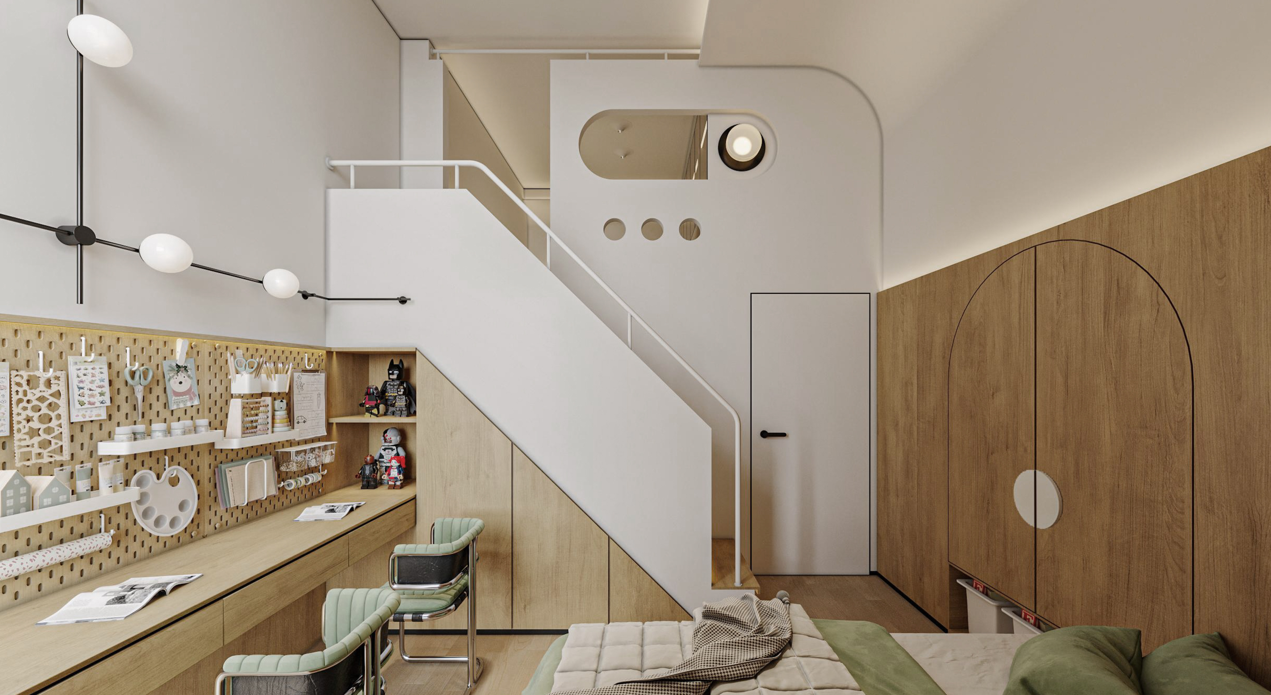 The children's room is specially designed with a mezzanine that allows the upper and lower floors to rest separately, increasing the efficiency of space utilization and meeting the entertainment and sleep needs of children.