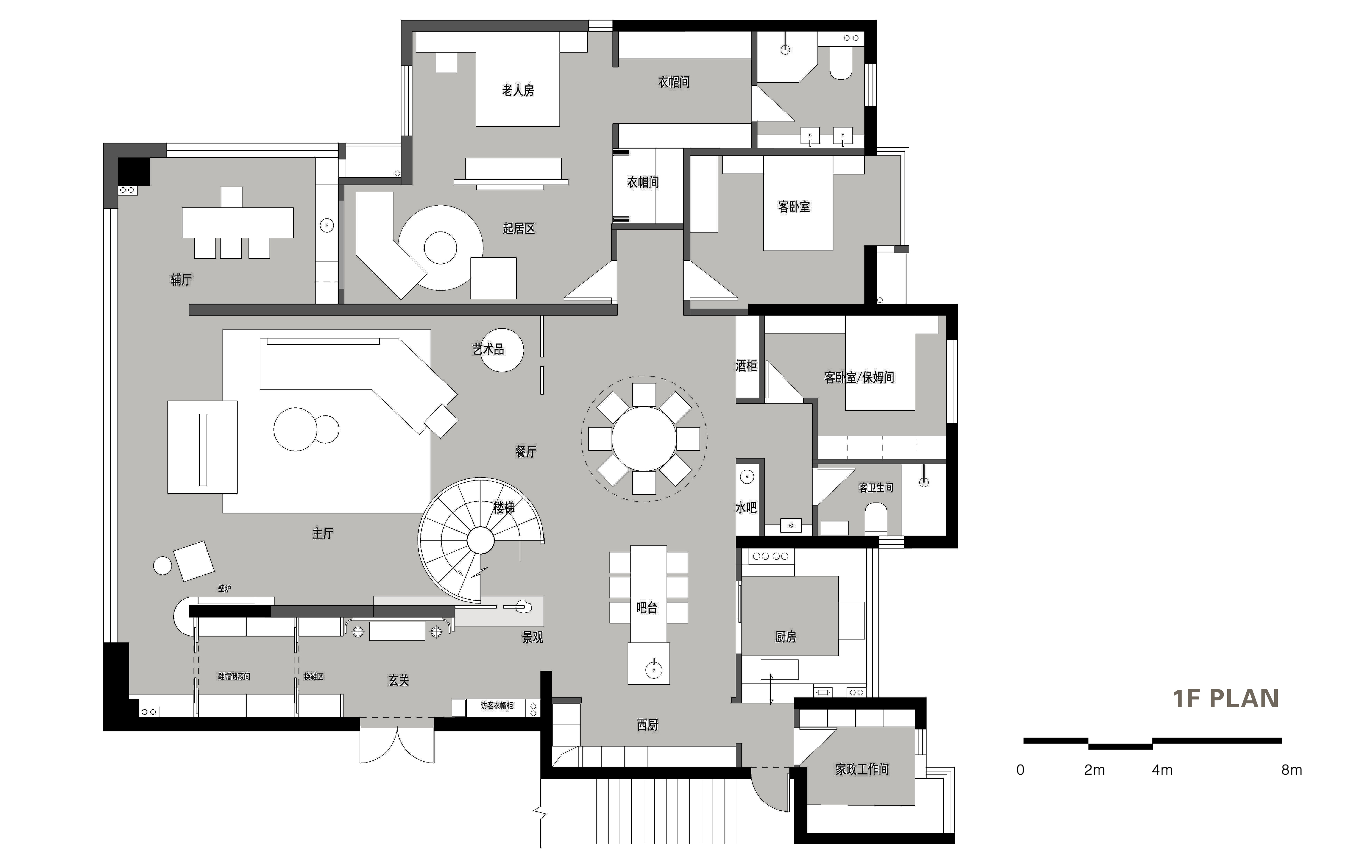 一层以开放式布局为主,将挑空客厅、餐厅、厨房融为一体,营造开阔通透的空间感。旋转楼梯作为视觉焦点,连接上下两层,其流畅的线条与客厅挑空区域形成呼应,宛如一件艺术品,增强空间层次感和品位。