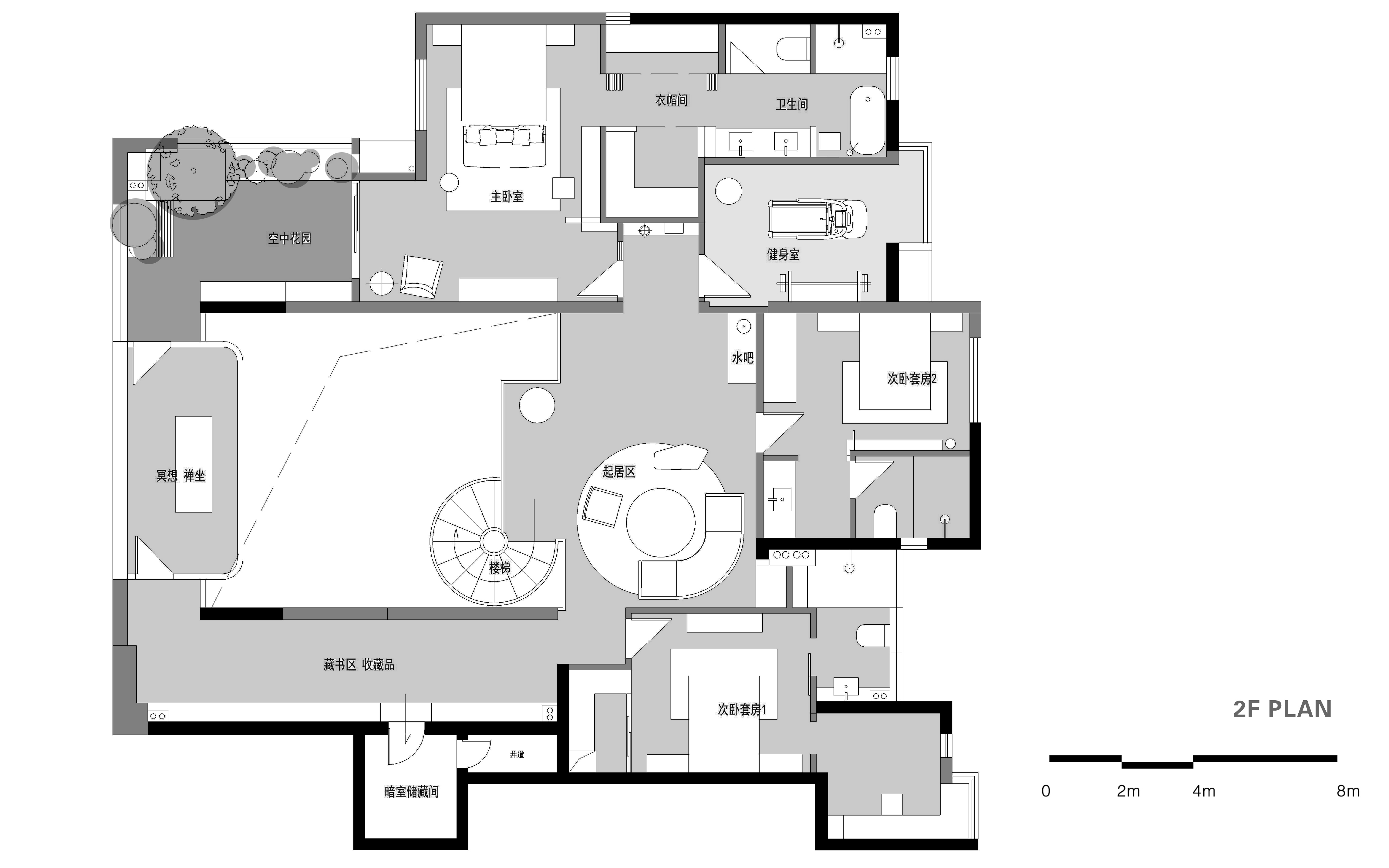 二层规划为私密休息区,包含主卧、次卧、书房等功能空间。主卧配备独立衣帽间和卫生间,提升居住舒适度。