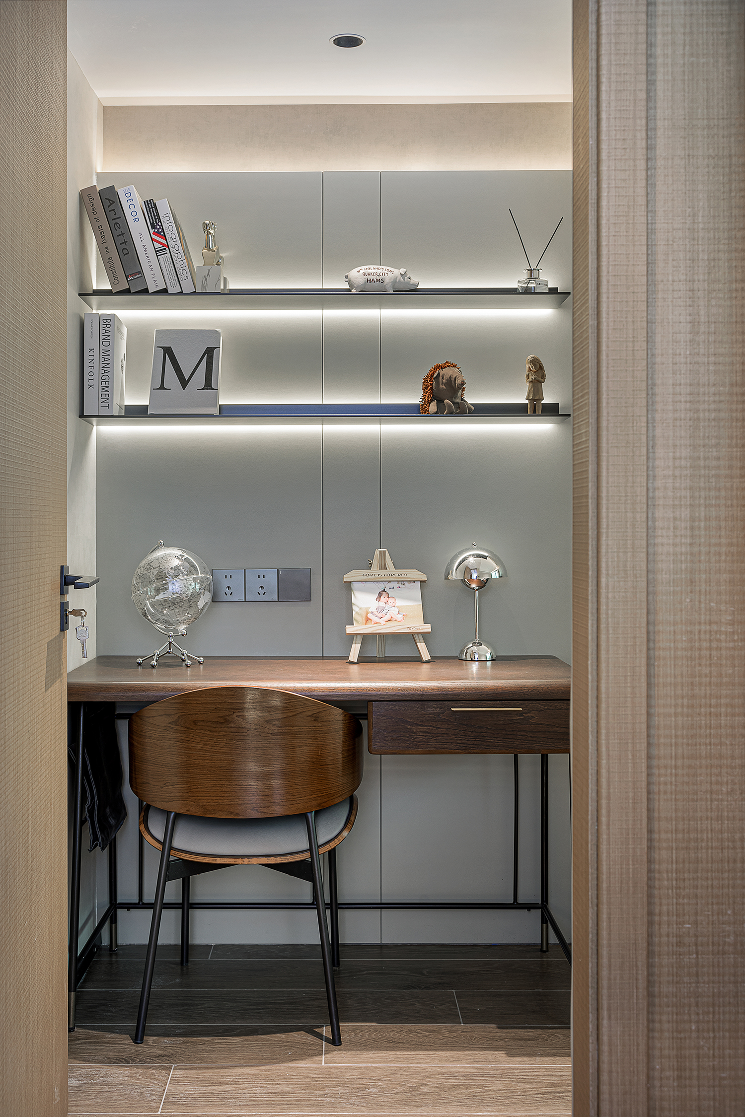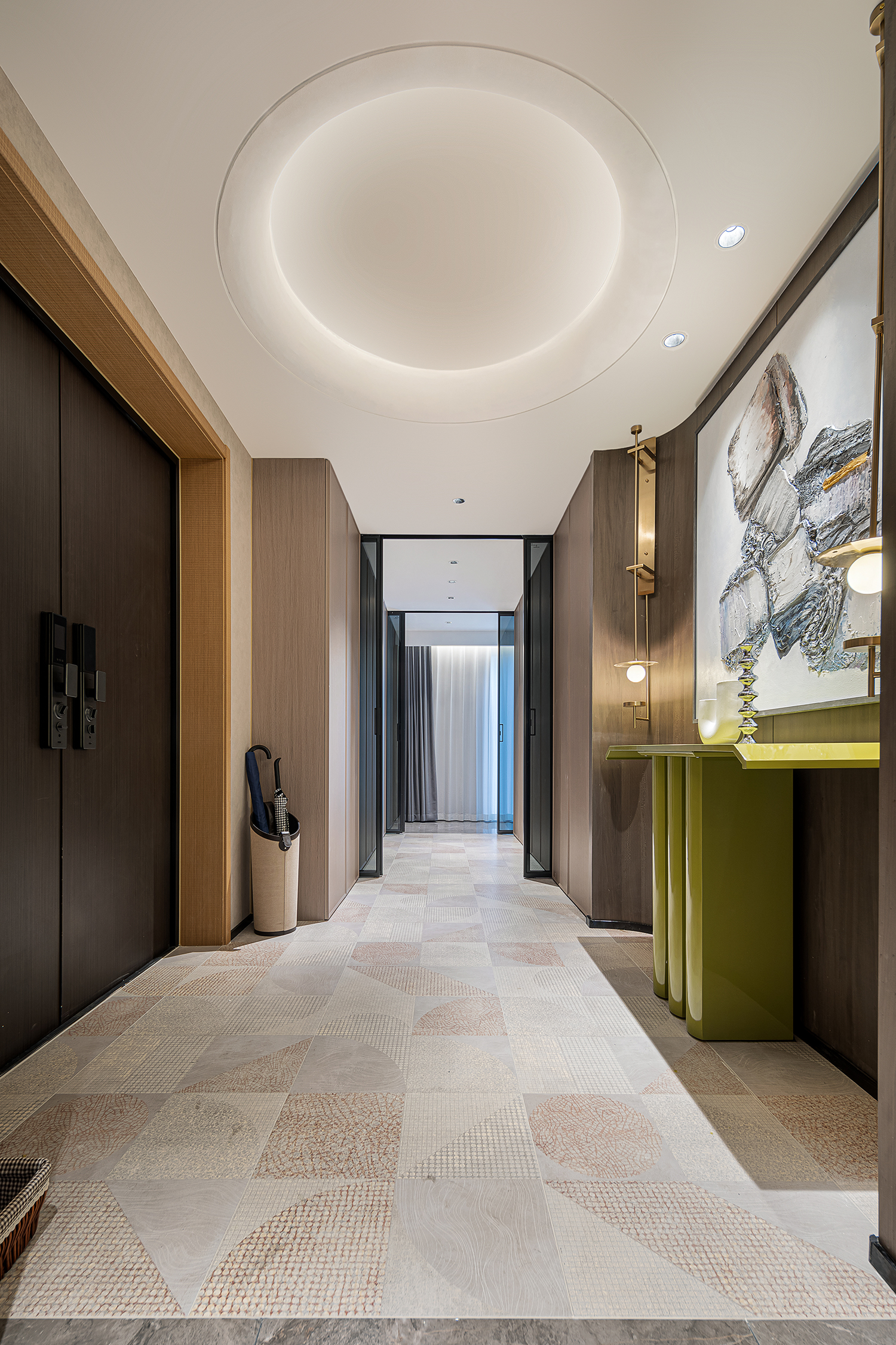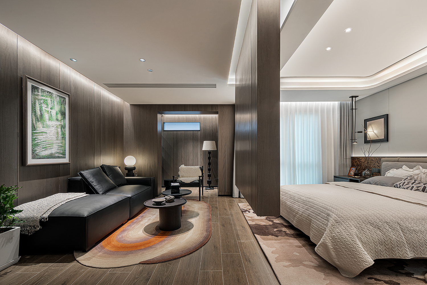 挑空设计最大化引入自然光线,营造开阔明亮的空间感。搭配简洁利落的家具和艺术装饰品,公区墙面采用锯齿木墙板,其独特的造型与纹理,为空间增添了一份自然质朴的气息,同时与整体简约现代的风格形成对比,凸显人文情怀。