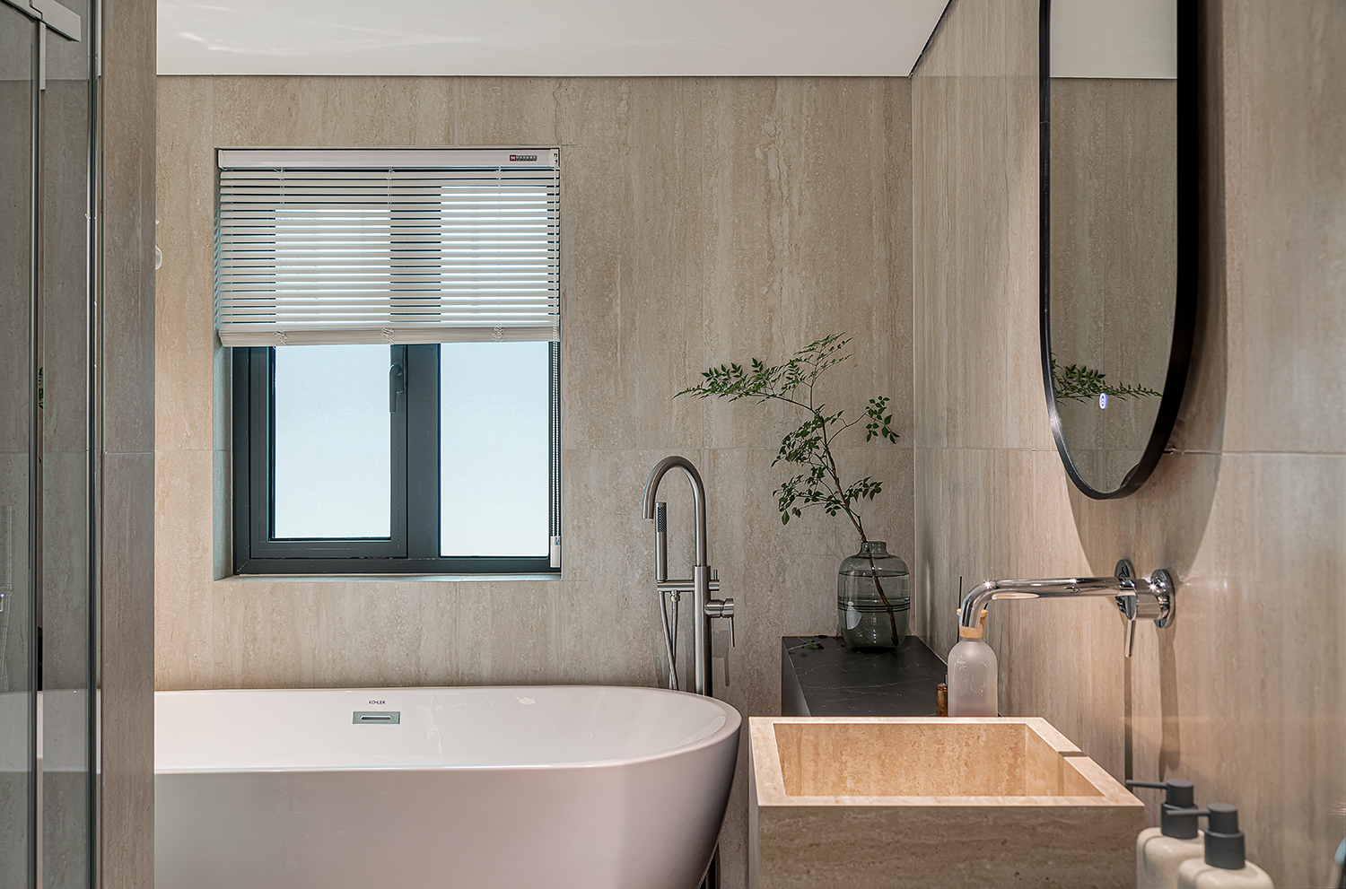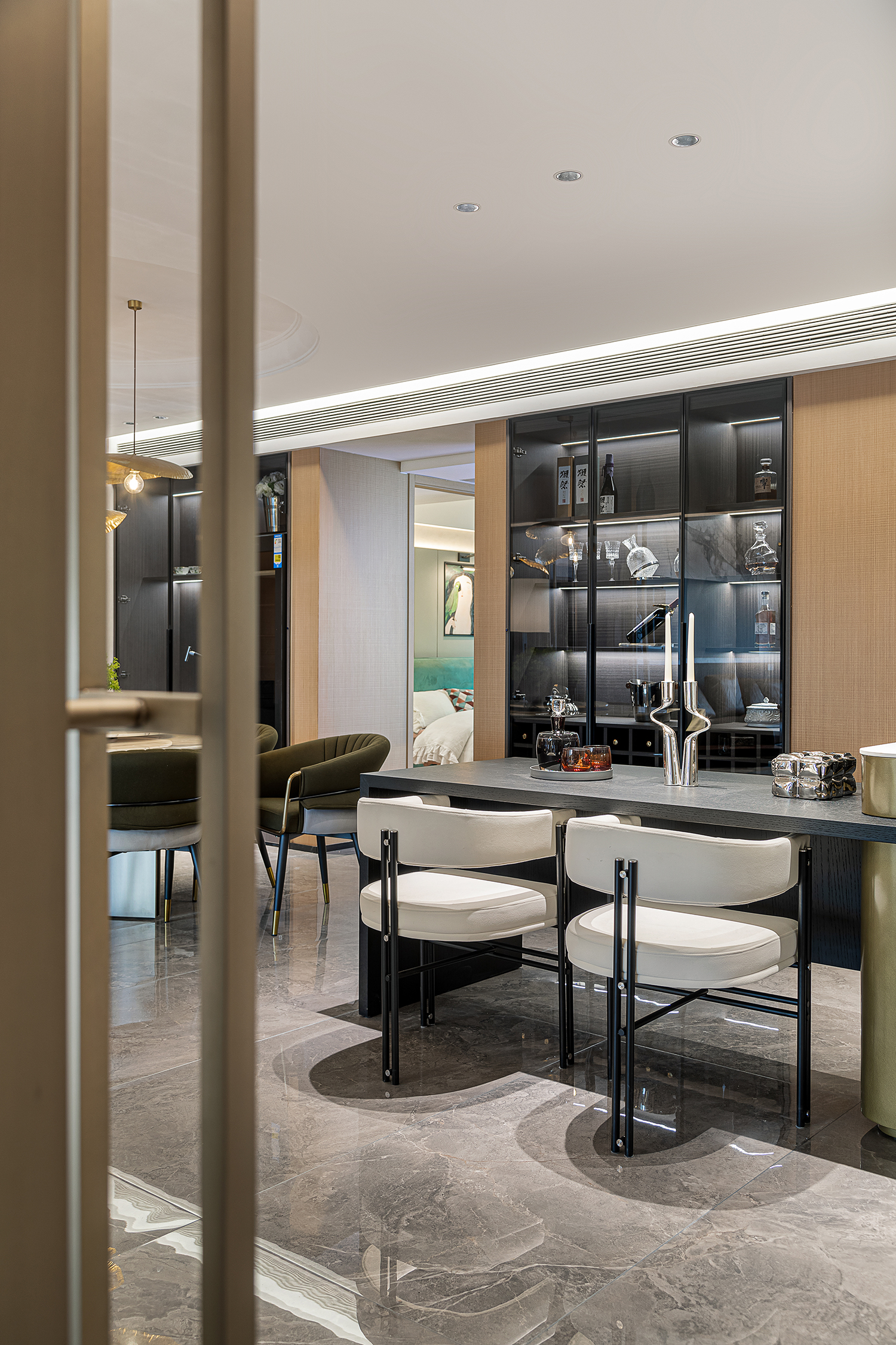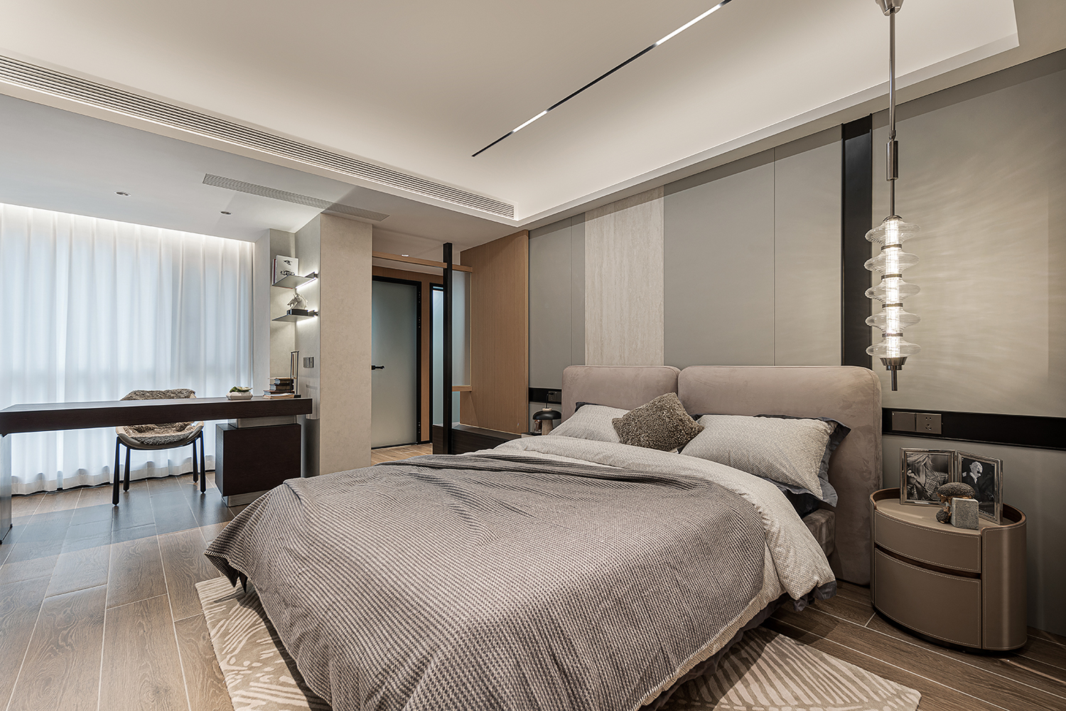 挑空设计最大化引入自然光线,营造开阔明亮的空间感。搭配简洁利落的家具和艺术装饰品,公区墙面采用锯齿木墙板,其独特的造型与纹理,为空间增添了一份自然质朴的气息,同时与整体简约现代的风格形成对比,凸显人文情怀。