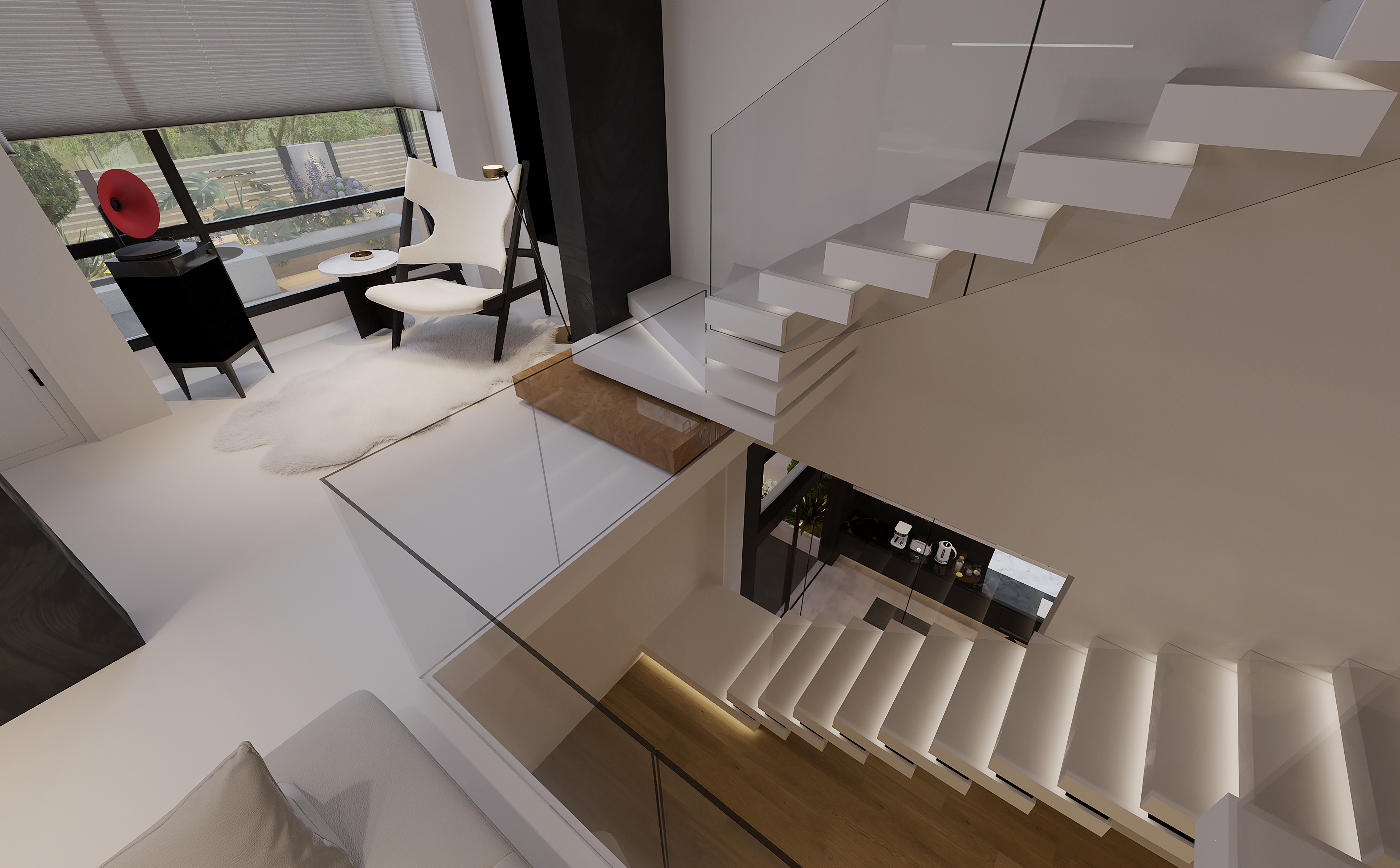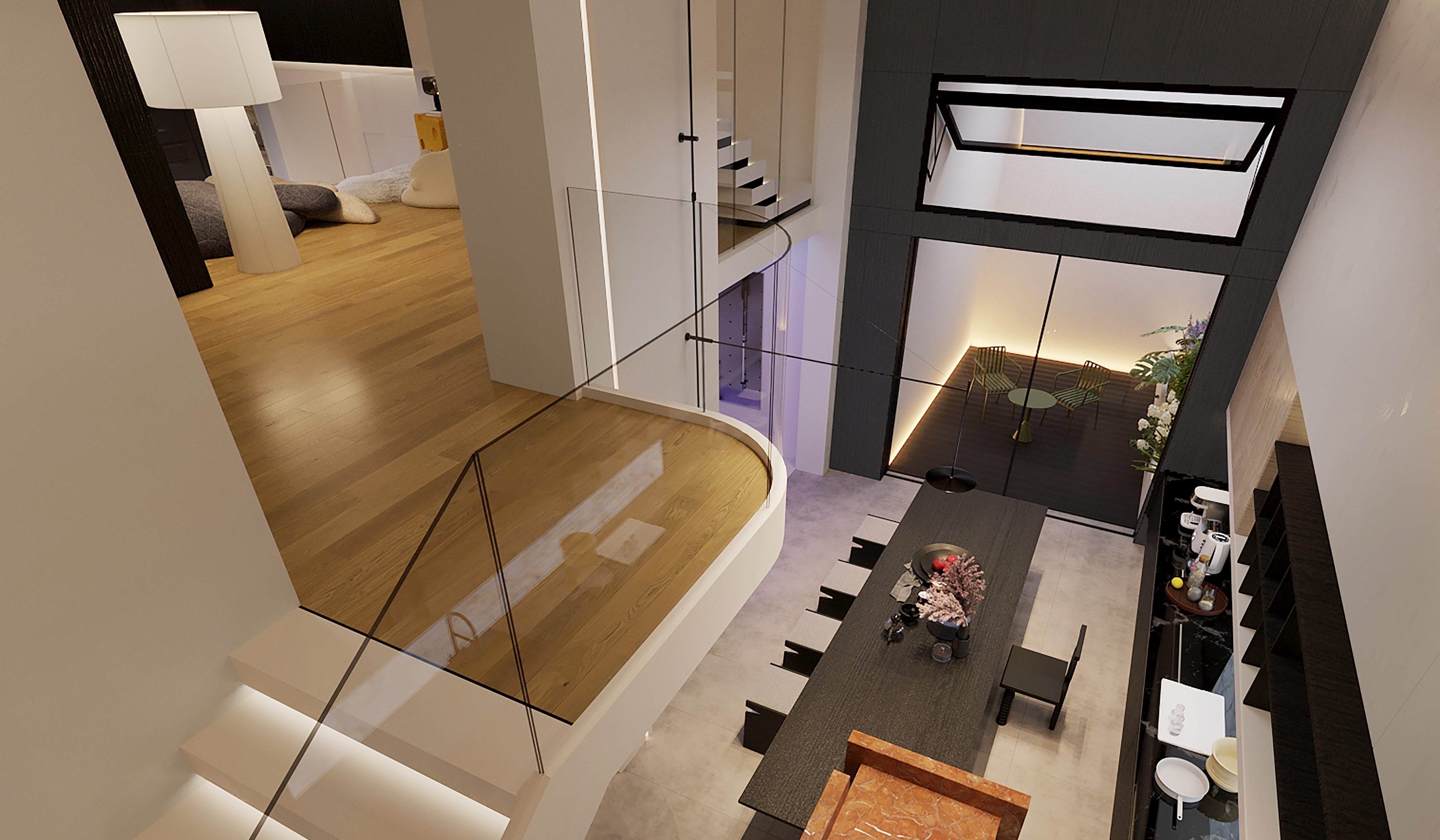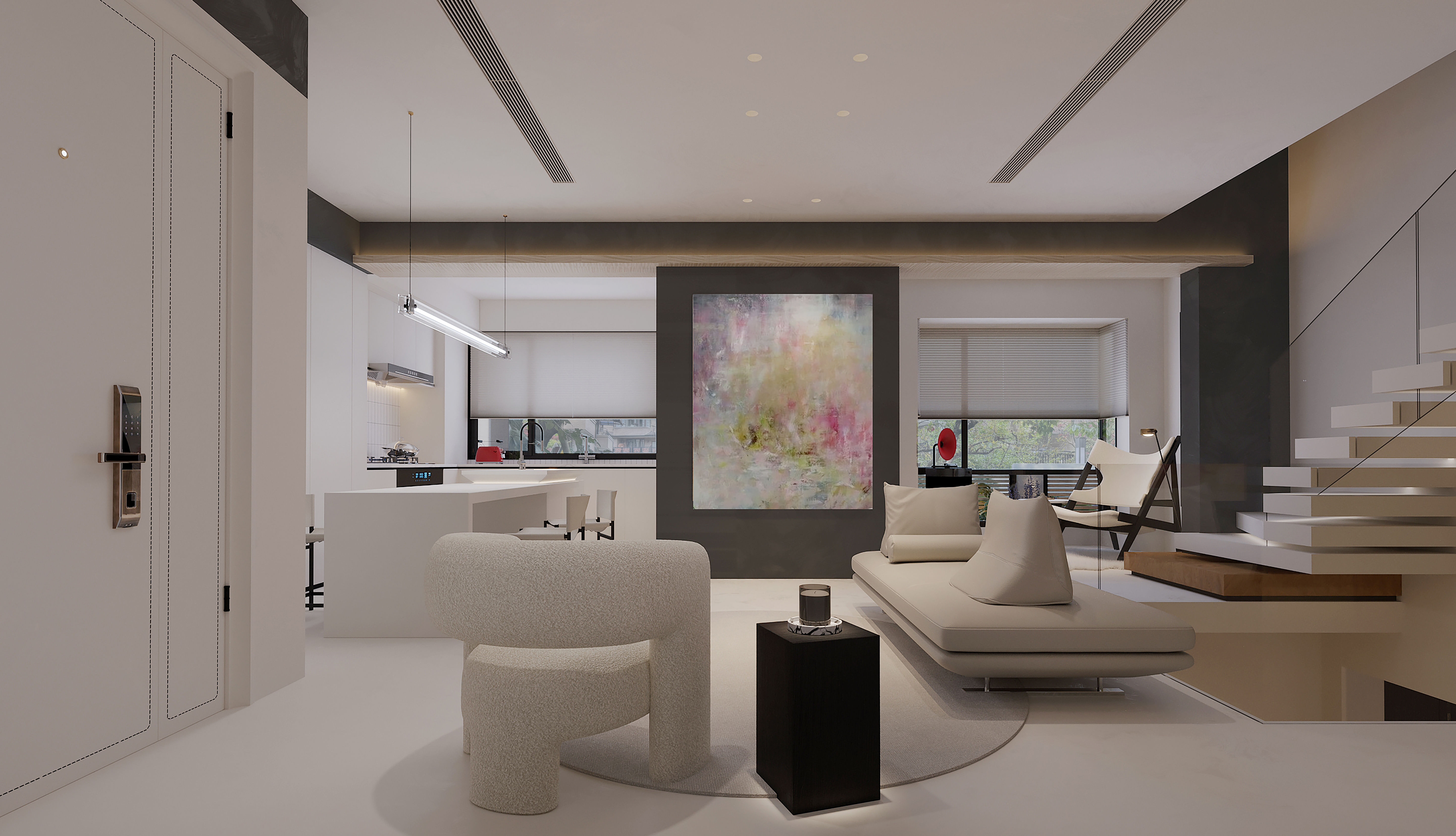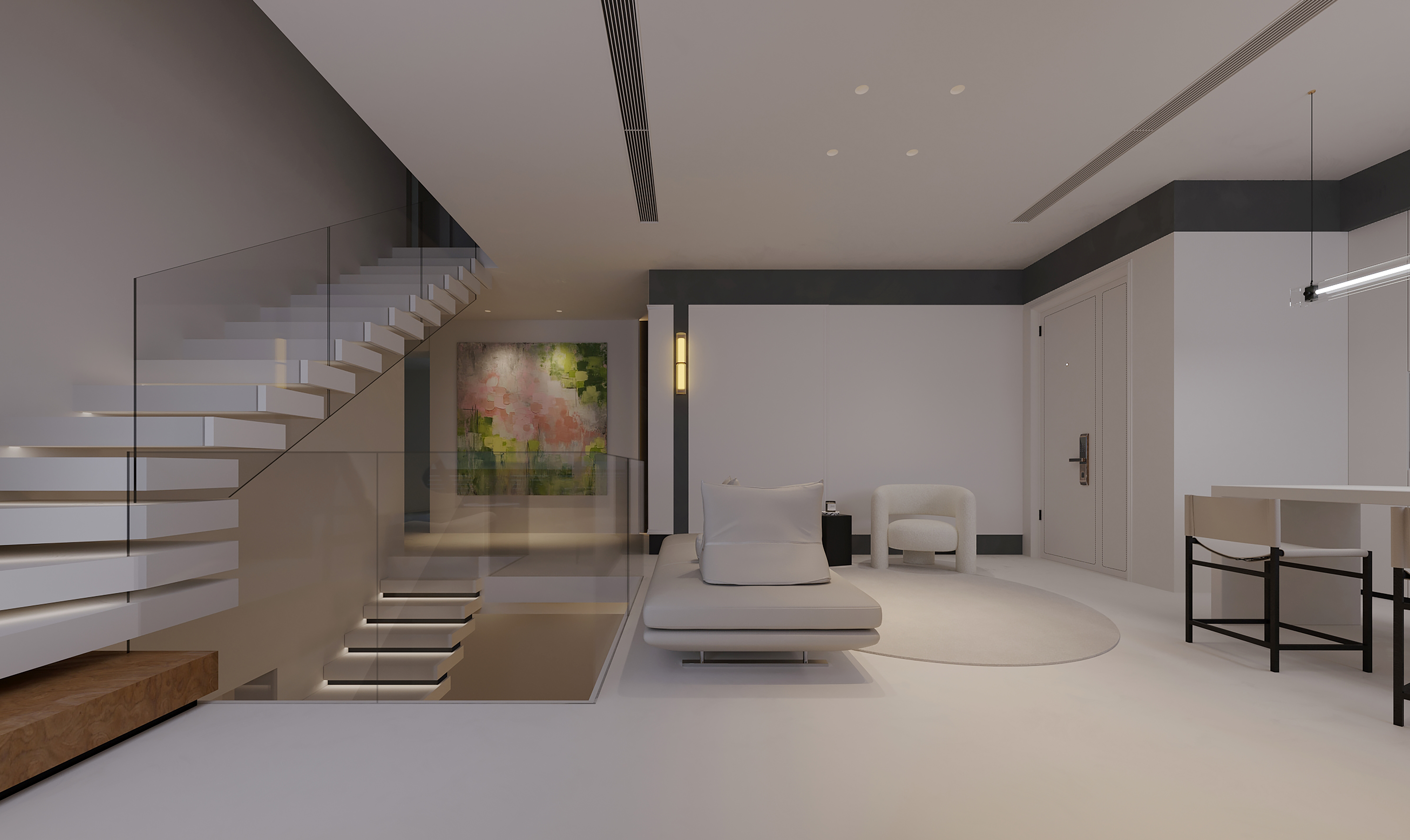 Dismantle some non load bearing walls and introduce an open design, allowing the living room, dining room, and kitchen to naturally connect and form a smooth living flow. The staircase adopts a hollow design, paired with transparent glass handrails, allowing light to freely shuttle and creating a bright and transparent sense of space.