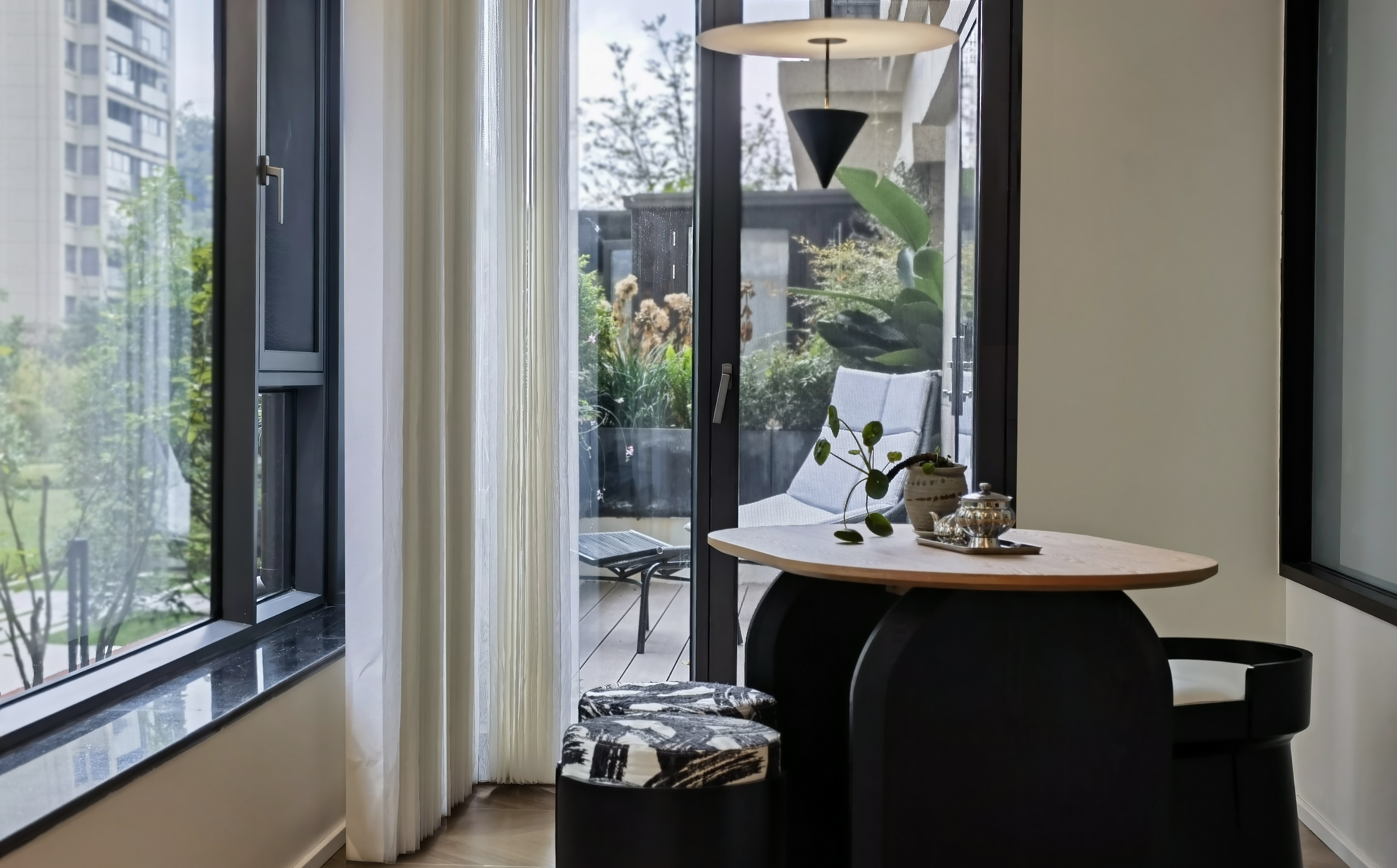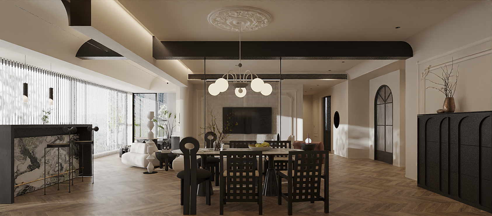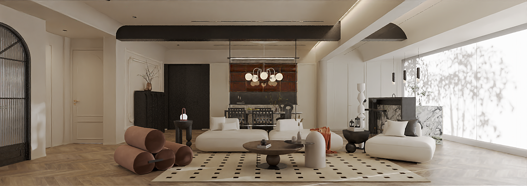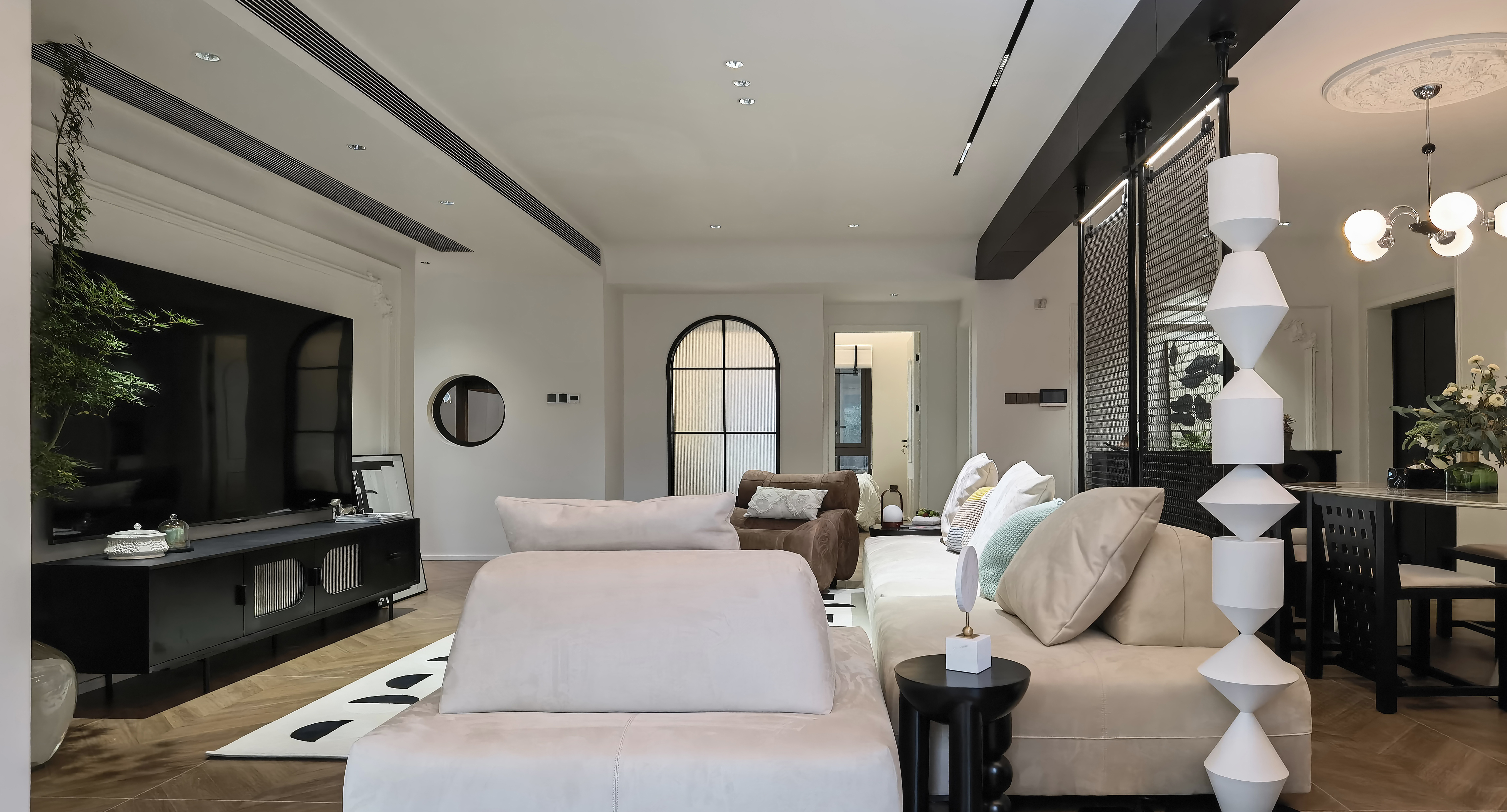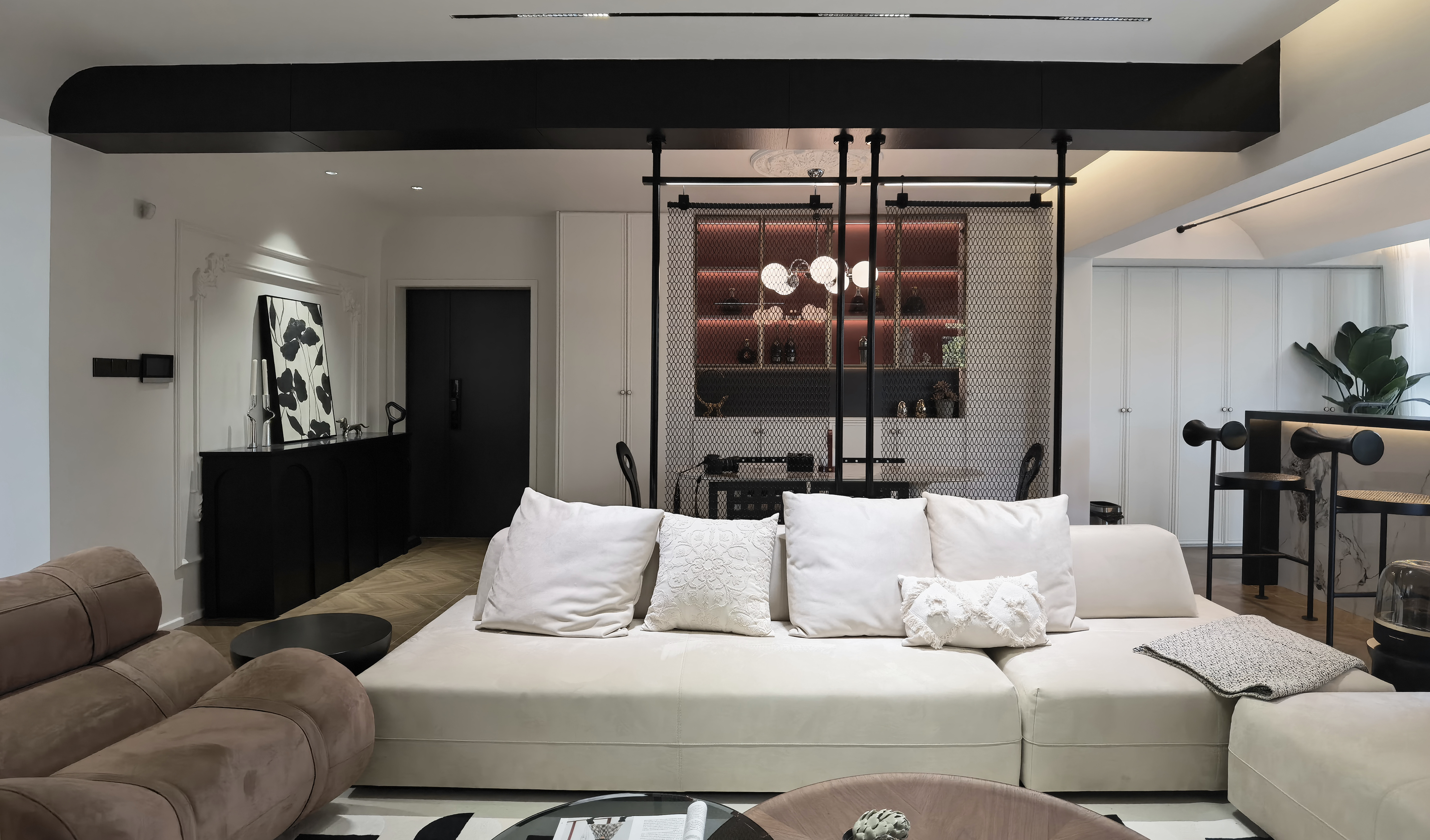 作为大横厅的核心区域,客厅采用轻中古风格,柔软的布艺沙发、复古的地毯、精致的金属灯具,营造出慵懒舒适的氛围。大面积落地窗将室外景色引入室内,阳光洒满整个空间,令人心旷神怡。