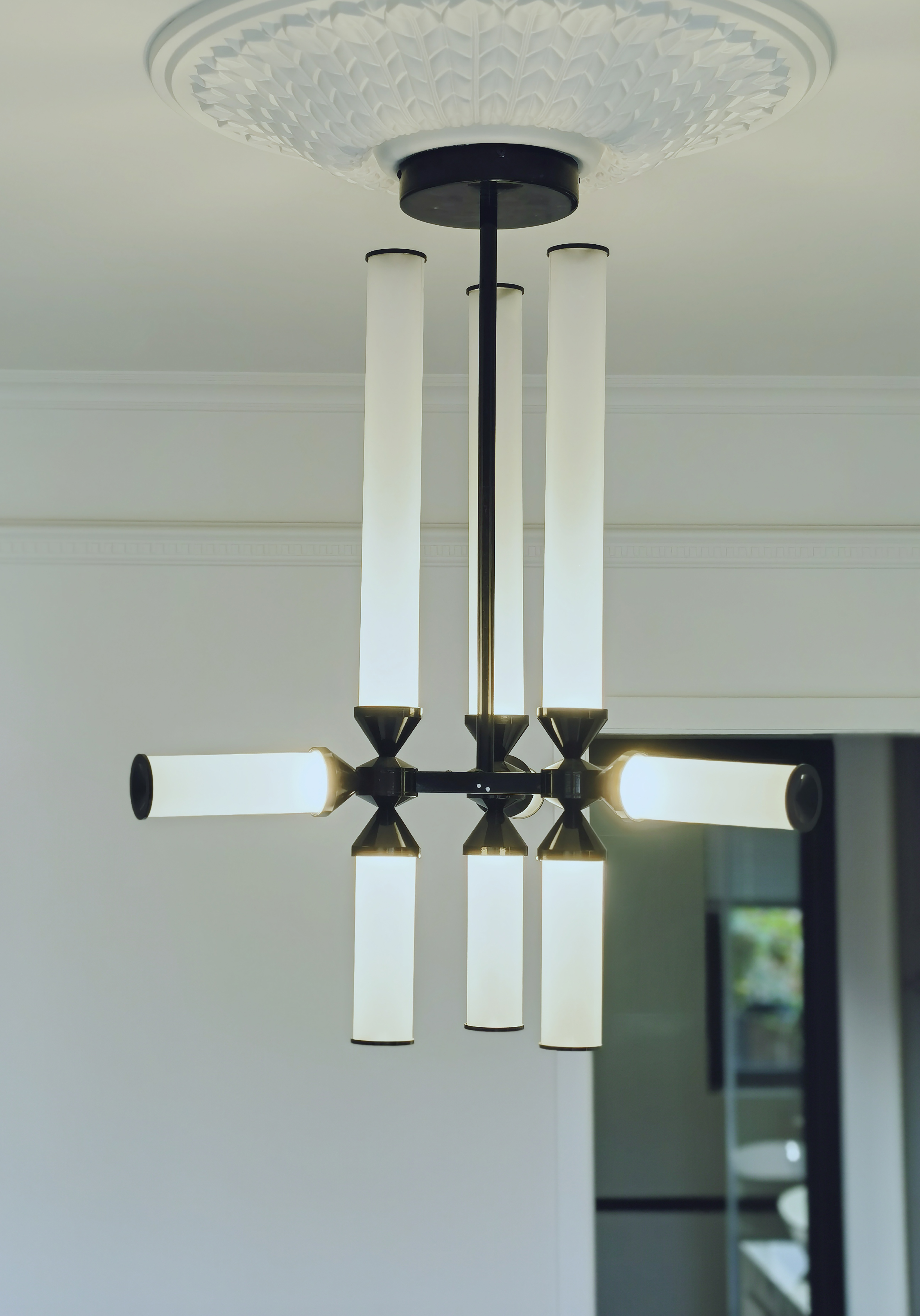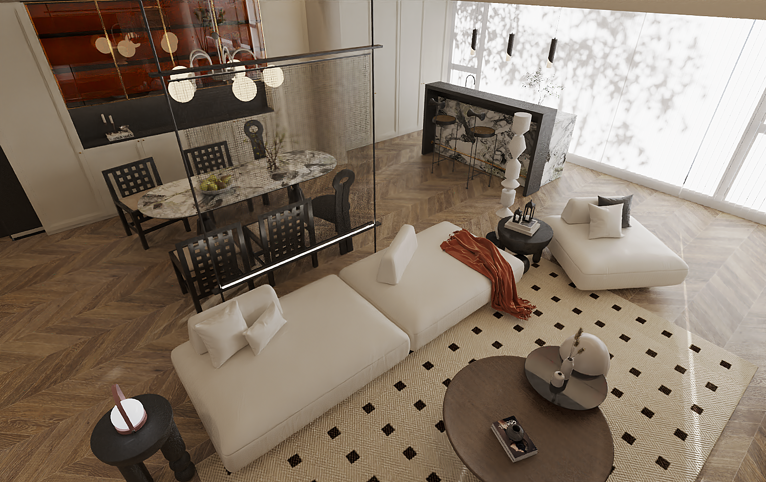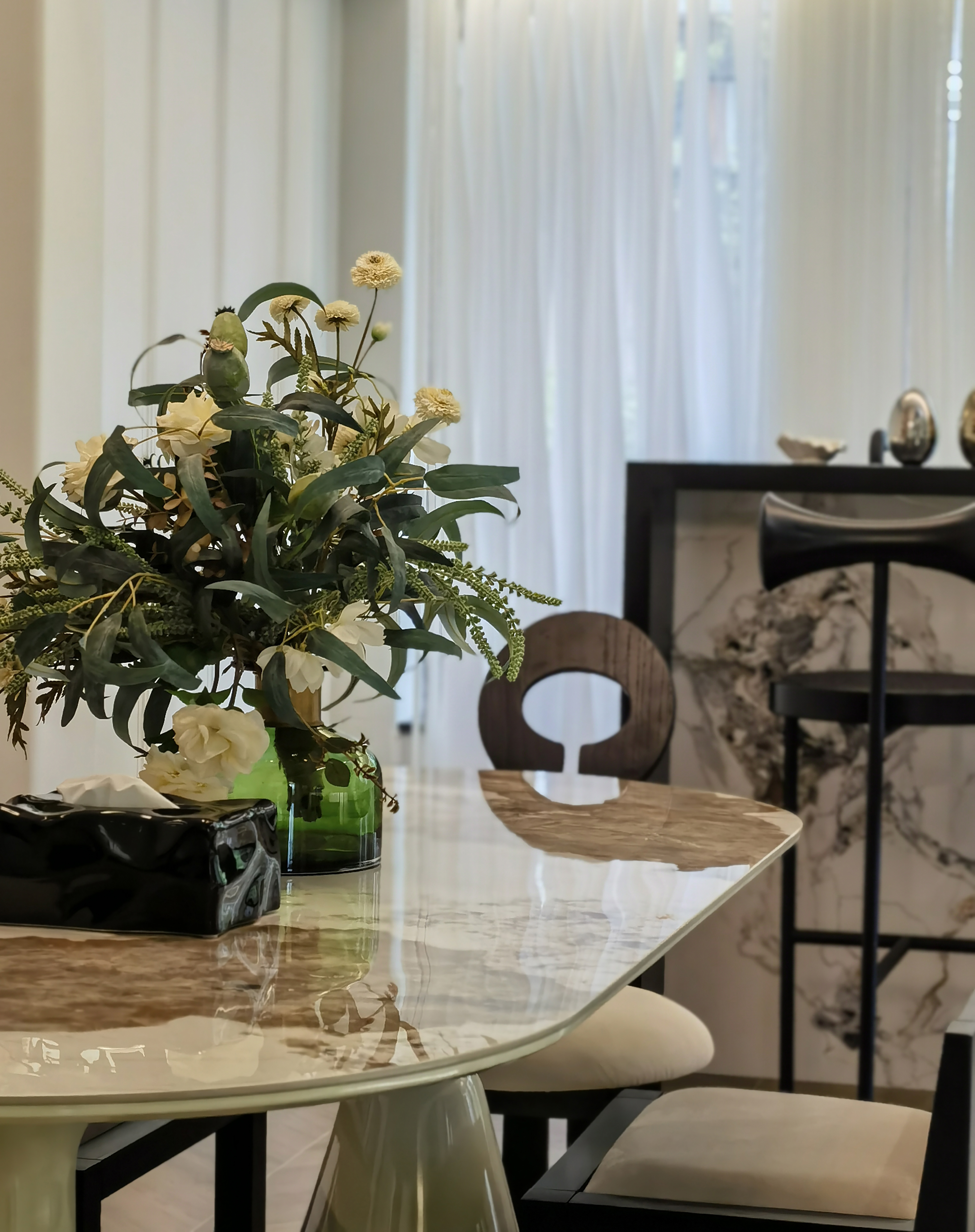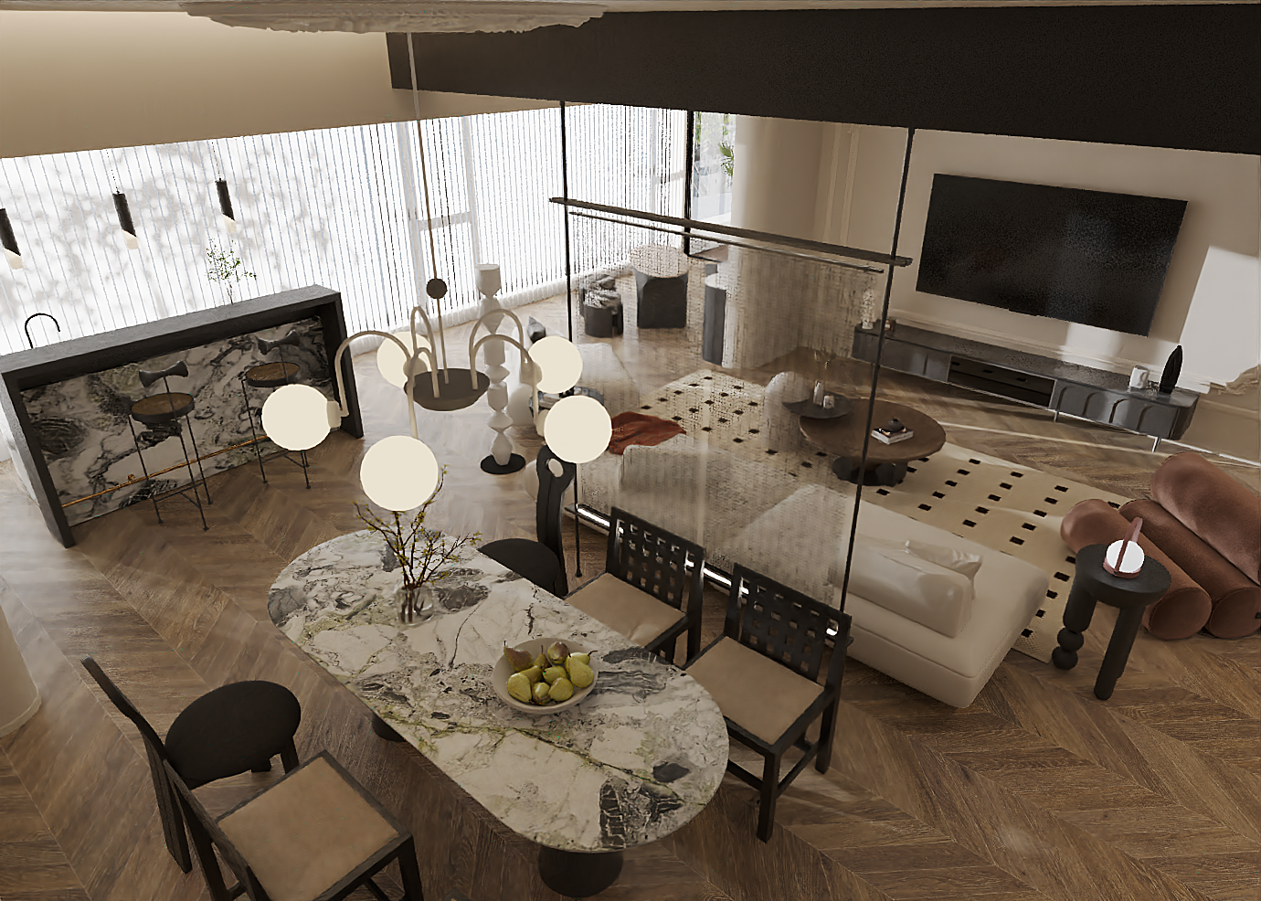 作为大横厅的核心区域,客厅采用轻中古风格,柔软的布艺沙发、复古的地毯、精致的金属灯具,营造出慵懒舒适的氛围。大面积落地窗将室外景色引入室内,阳光洒满整个空间,令人心旷神怡。